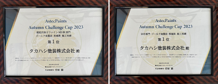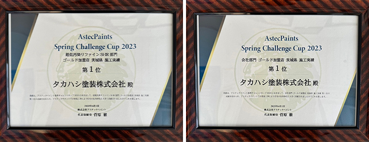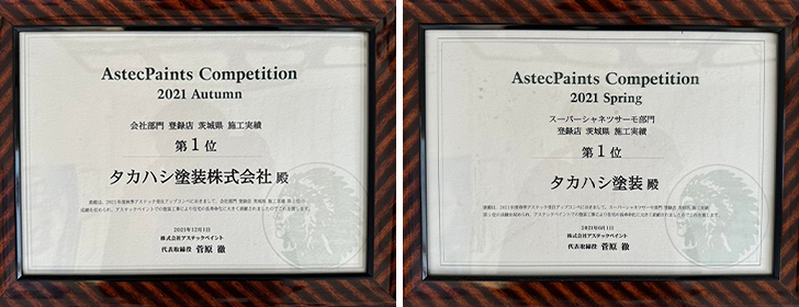 12月 アステックペイント 会社部門 登録店 茨城県 施工実績 第1位 6月 アステックペイント スーパーシャネツサーモ部門 登録店 茨城県 施工実績 第1位 6月 アステックペイント 会社部門 登録店 東北・北関東エリア 施工実績 第1位 |