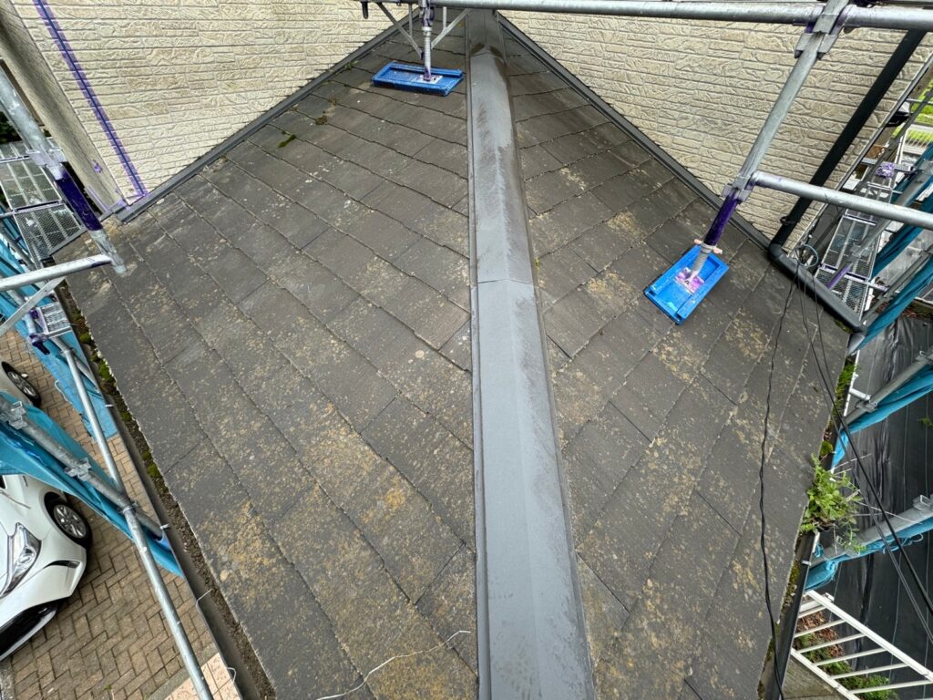 築21年のお家になります。現地調査の際に既存の屋根はアスベストが含まれていない、スレート屋根(コロニアルNEO)という屋根材と判断ができました。この屋根の特徴は無差別にひび割れが起こり、塗装でのメンテナンスが厳しい屋根材になります。その為、今回は新しい屋根を既存の上に被せる、屋根カバー工法を行いました。