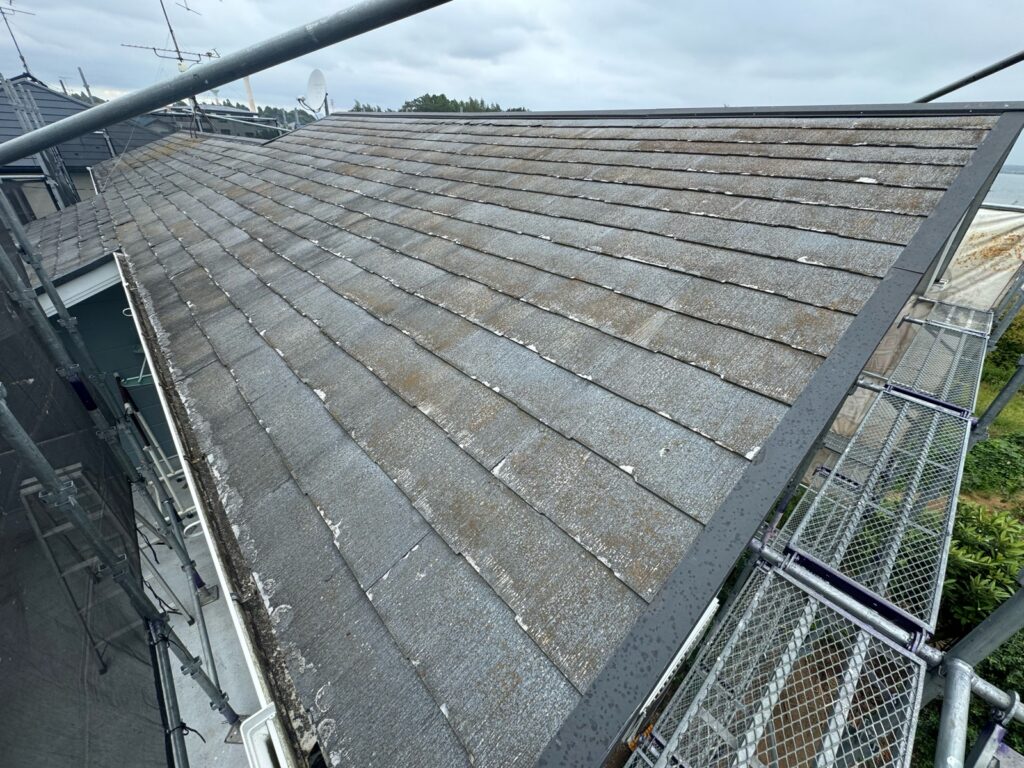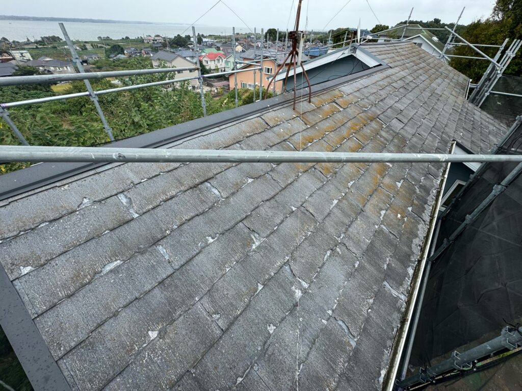 既存の屋根は『パミール』という屋根材になります。パミールはアスベストが含まれていなく、無差別に剝離が起こる貧弱な屋根材になります。