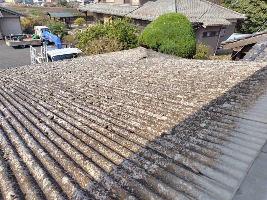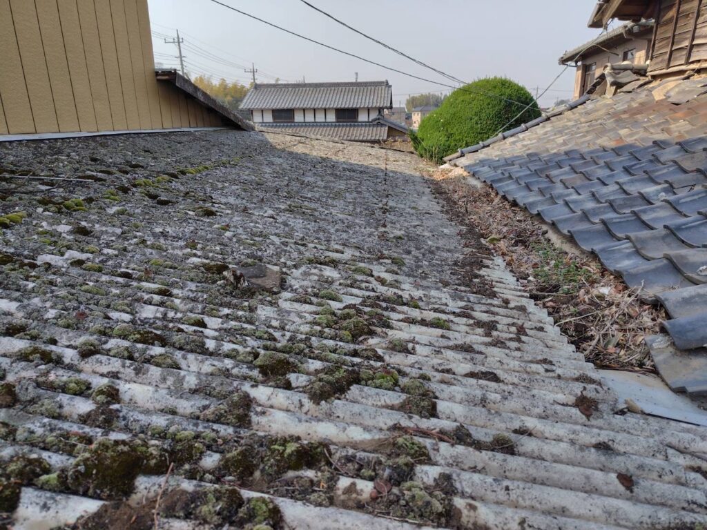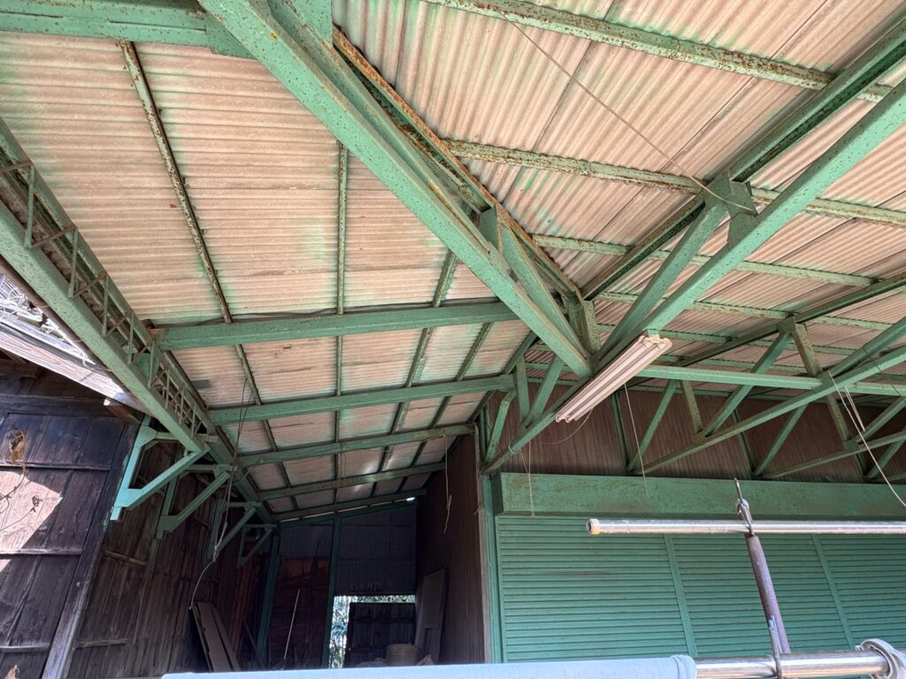 【ご提案】:お問い合わせありがとうございます。現地調査にお伺いをさせていただくと、屋根材は『波型スレート』という屋根材でした。こちらの屋根は強度があまり強くなく、荷重がかかると割れてしまう特徴がある屋根材です。雨漏れがしているということでしたので、部分的な補修工事ではなく、今回は波板ガルバリウム鋼板という屋根材にて葺き替え工事のご提案させていただきます。