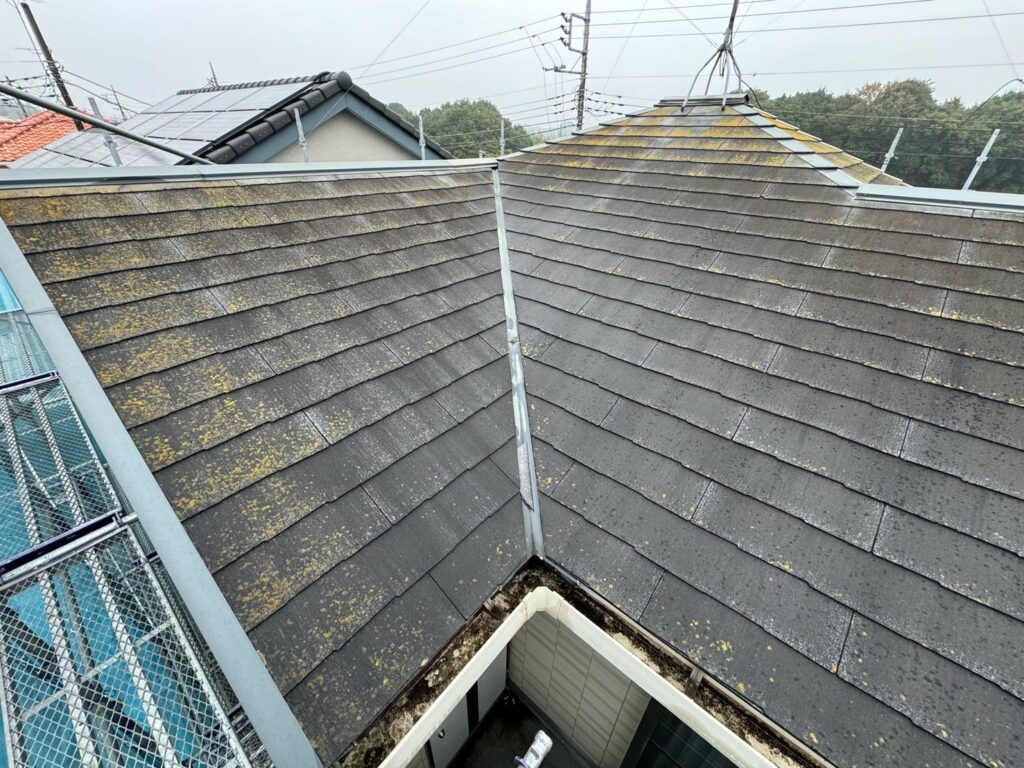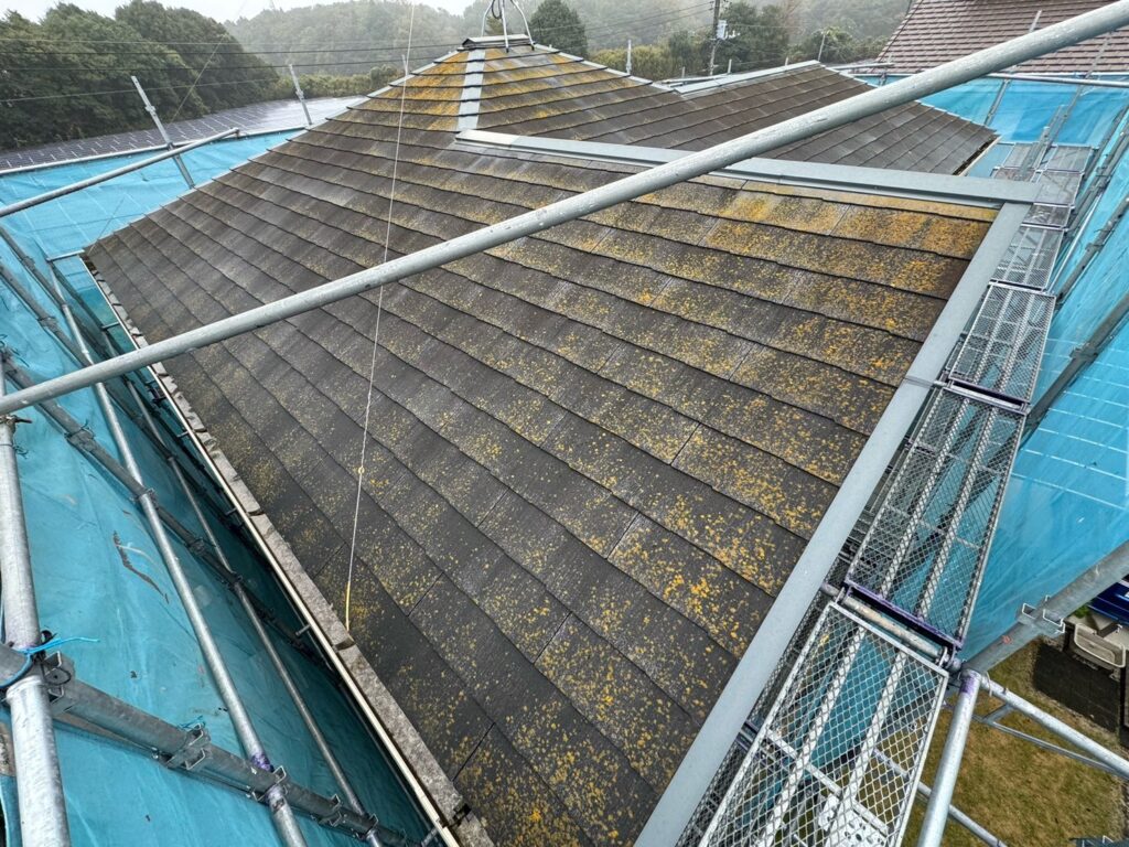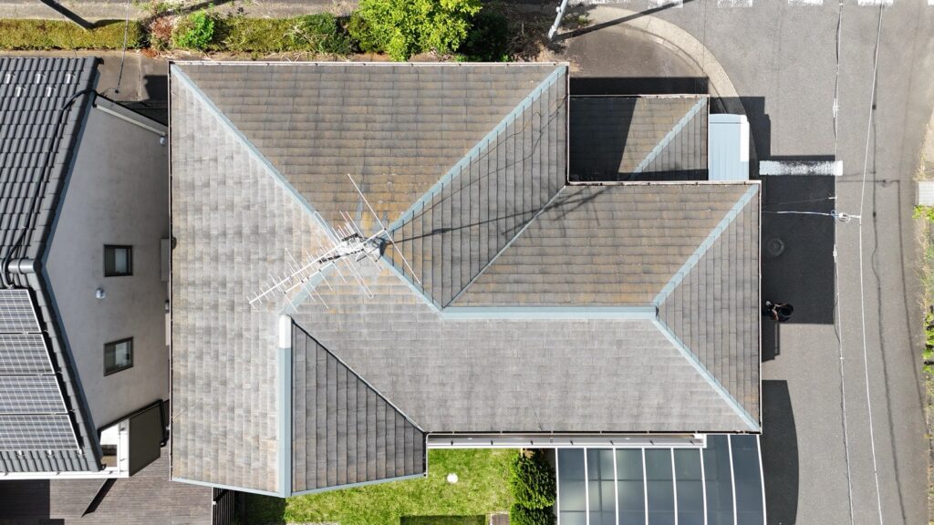 【ご提案】:お問い合わせありがとうございます。ドローン調査にて屋根を確認させていただいたところ、既存の屋根はコロニアルクアッドでした。築16年ですがコケやカビの付着が多く確認できました。アイジー工業のスーパーガルテクトを気に入っていただき、今回はスーパーガルテクトにて屋根カバー工法のご提案をさせていただきます。