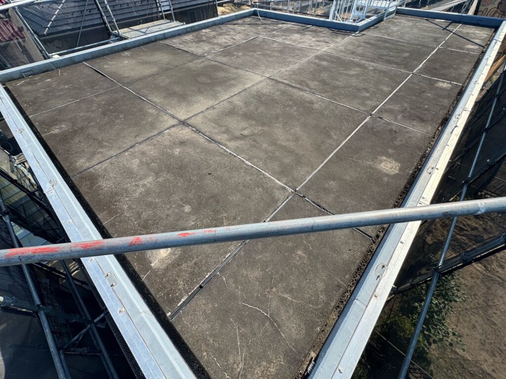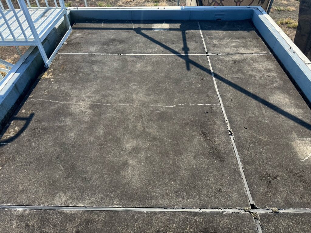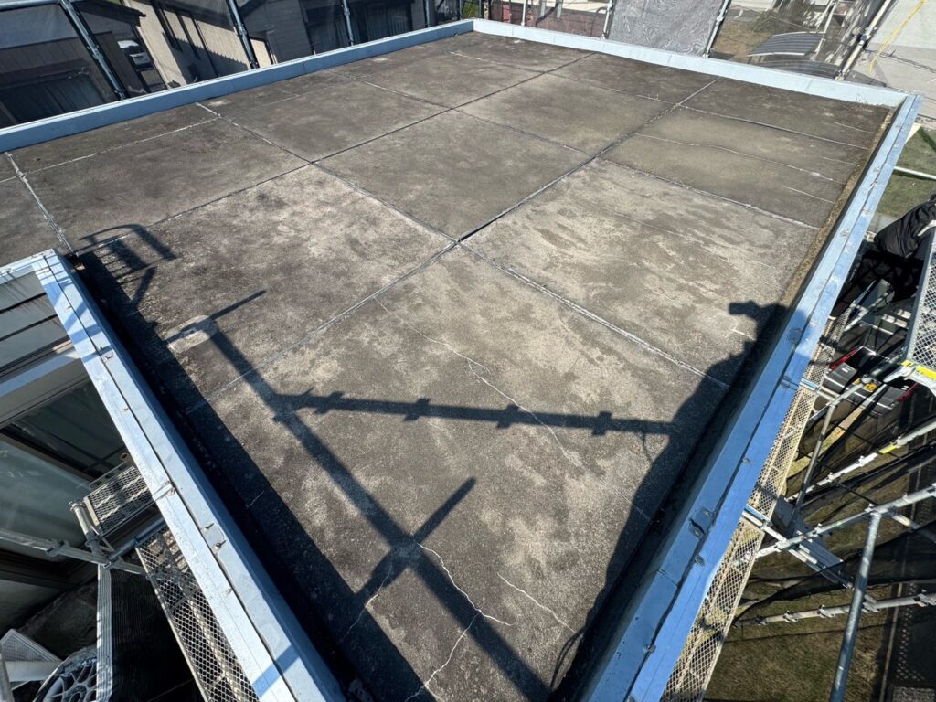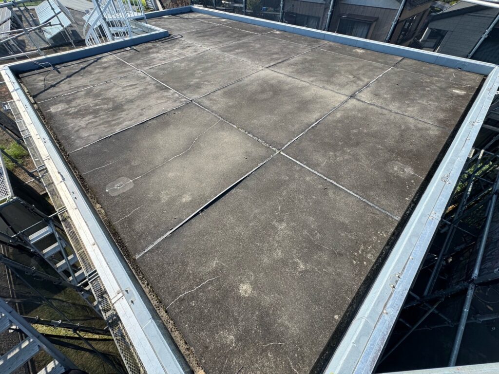 【お客様のご要望】築15年ほどになります。現状雨漏れ等はありませんが、全体の汚れや繋ぎ目の剝がれ、表面にひび割れがでてきている為、雨漏れがしないか心配です。今後に向けて防水のメンテナンスを検討しています。