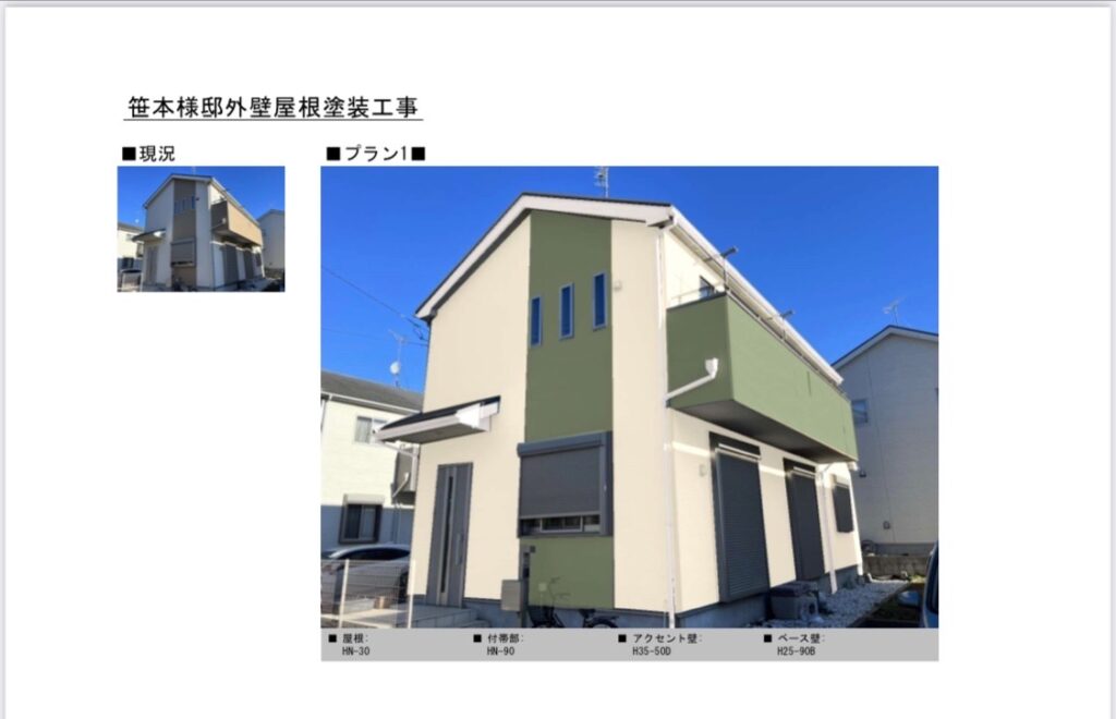 | 使用商材・建材 | 外壁…アステックペイント 超低汚染リファインMF-IR 白色・・・ブロークンホワイト、緑色・・・ミストグリーン 屋根…アステックペイント スーパーシャネツサーモF 色・・・カーボングレー コーキング…オート化学工業 オートンイクシード |