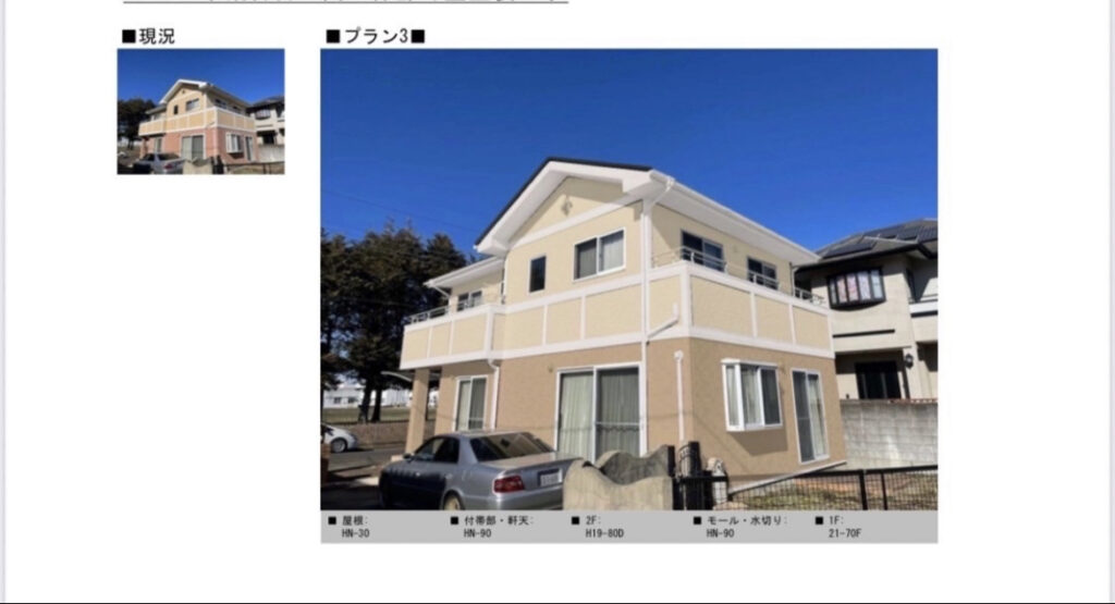| 使用商材・建材 | 外壁…アステックペイント 超低汚染リファインMFーIR 2階色(3回塗り)...スムースクリーム 1階色(5回塗り)...ミッドビスケット・トスカニー コーキング…オート化学工業 オートンイクシード 屋根材…アイジー工業 スーパーガルテクト 色...ワインレッド 防水シート…タジマ タディスセルフカバー(粘着タイプ) |